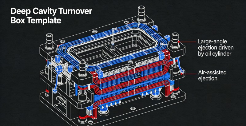 Uitdaging: Grote volumes en dikke wanden van logistieke containers resulteren in langere koeltijden, waardoor de productiecapaciteit wordt beperkt. Oplossing: Ontwerp meerlaagse seriële hogesnelheidskoelkanalen die alle dikwandige gebieden dicht bedekken. Voor containers met diepe holtes combineert u “hydraulische cilinderaangedreven schuine uitwerpers met grote hoek” met “gasondersteunde uitwerping” om een soepele, snelle ontkisting in minimale tijd te garanderen, zonder vervorming of vacuümhechting, waardoor productiecycli worden geminimaliseerd.