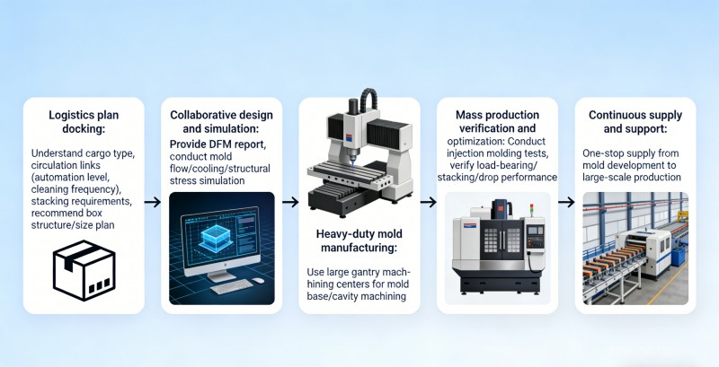 1. Afstemming van logistieke oplossingen: Begrijp uw vrachttype, afhandelingsfasen (bijvoorbeeld automatiseringsniveau, schoonmaakfrequentie) en stapelvereisten om optimale oplossingen voor de containerstructuur en -afmetingen aan te bevelen. 2. Collaboratief ontwerp en simulatie: Bied uitgebreide DFM-rapporten en voer simulaties van matrijsstroom, koeling en structurele spanning uit om optimale matrijsoplossingen te garanderen, zowel qua prestaties als qua kosten. 3. Productie van matrijzen voor zwaar gebruik: Maak gebruik van grote bewerkingscentra voor portaalconstructies om precisie en stijfheid te garanderen bij het bewerken van grote matrijsbodems en holtes. 4. Validatie en optimalisatie van massaproductie: voer continue productietests uit op spuitgietmachines om kritische prestatiegegevens (belastings-, stapel-, valtests) te valideren en processen af te ronden. 5. Continue levering en ondersteuning: wij bieden one-stop-levering, van matrijsontwikkeling tot grootschalige spuitgietproductie, waardoor een consistente productkwaliteit en tijdige levering worden gegarandeerd.